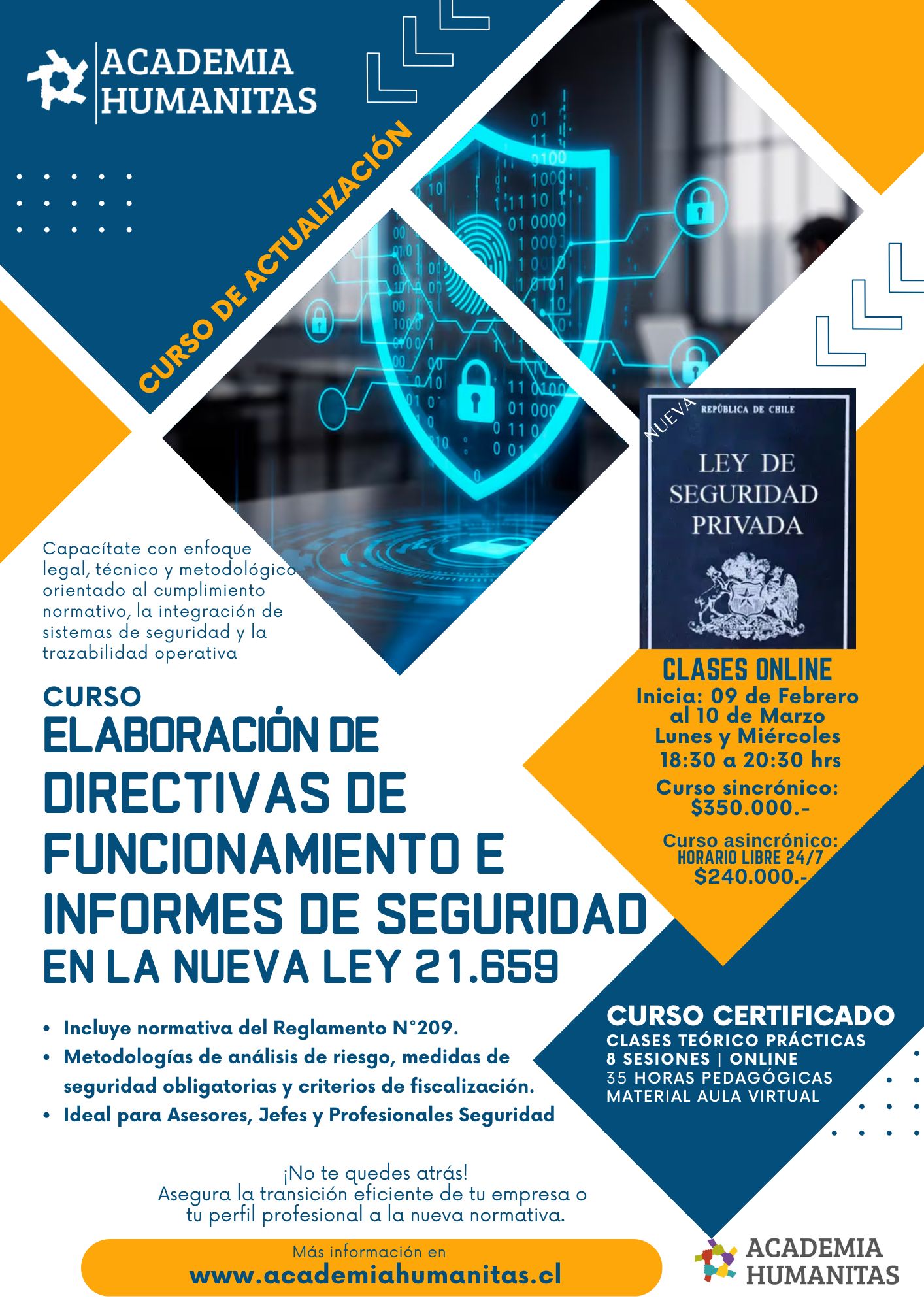 - Curso de Formación: Construcción de instrumentos de seguridad en la Ley 21.659. (Estudio de Seguridad, Planes de Seguridad y Directivas de Funcionamiento según la Ley N° 21.659)